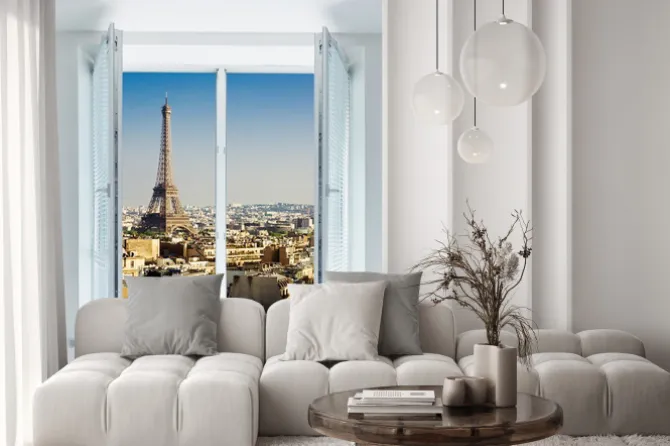 Okno z widokiem na Paryż i Wieżę Eiffla.