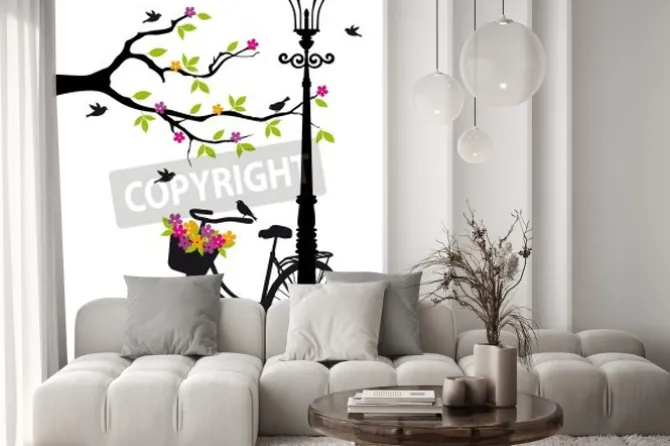 Naklejka: Old bicycle with lamp, flowers and tree