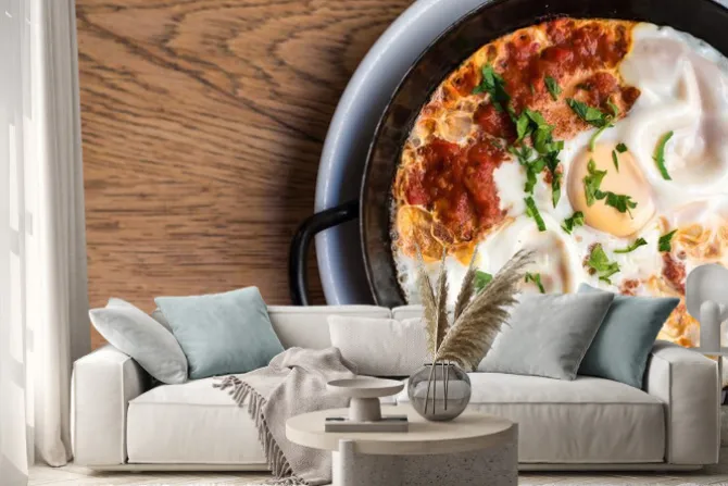 Naklejka: Orientalny omlet w ragout pomidorowym papryki ze świeżymi ziołami