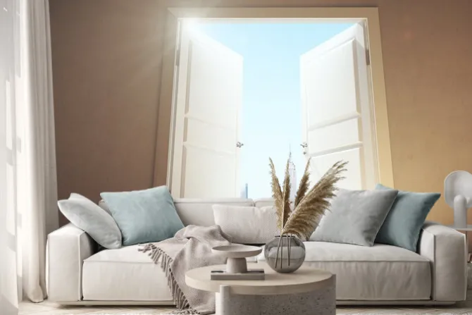 Otwarte drzwi z pustym pomieszczeniu Megapolis miasto z wieżowcami.