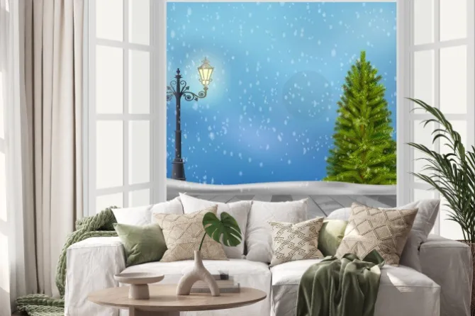 Naklejka: Otwórz okno choinka i latarni na tle zimowego