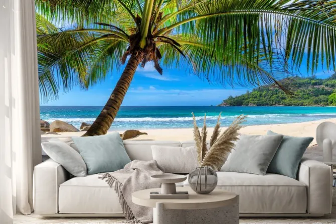 Naklejka: Rajska tropikalna plaża z palmami i białym piaskiem