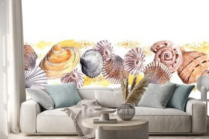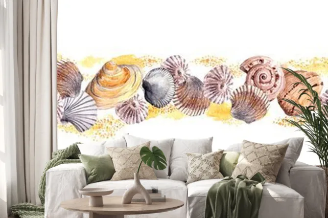 Seamless border wstążka z muszelek w piasku. ramka Akwarela.