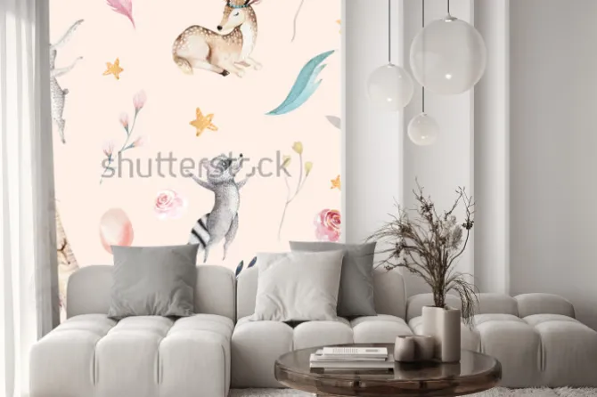 Śliczni rodzinni dzieci raccon, rogacz i królik. żyrafa zwierząt przedszkole i opatrzone ilustracja na białym tle. Akwarela boho raccon rysunek przedszkola wzór. Tło dla dzieci, projekt drukowania prz.