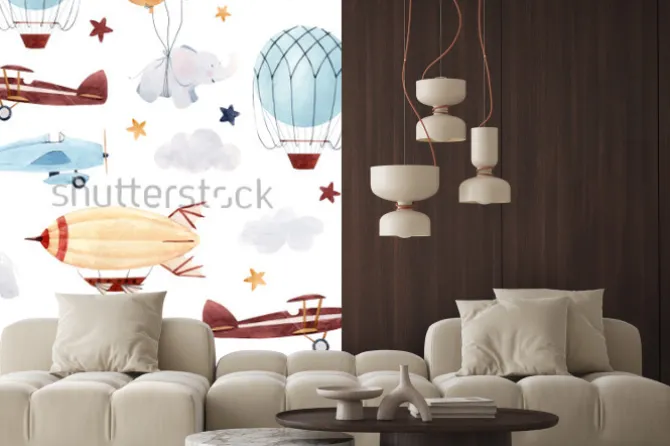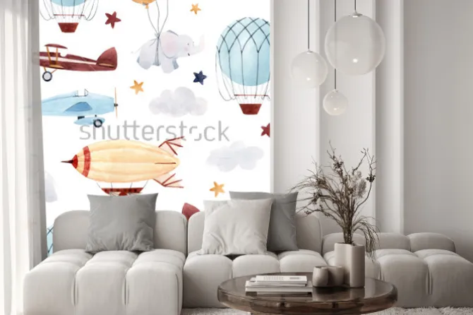 samoloty, retro, gwiazdy, pokój dziecięcy, samochody, słonie, niebo
