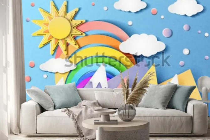 Wektorowa ilustracja piękny krajobraz z słońcem, tęczą, chmurami i górami. W stylu cięcia papieru..