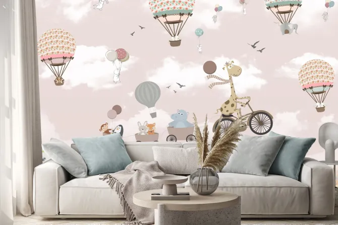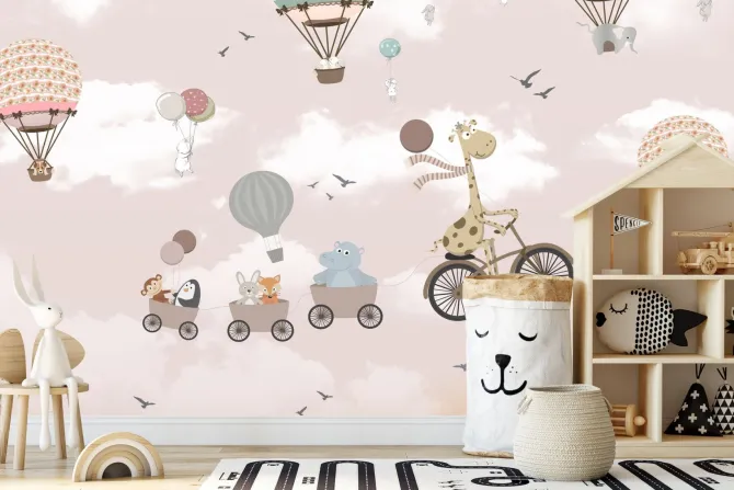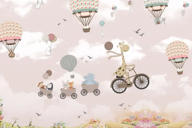Zwierzątka w pojazdach i balony na tle różowego nieba.