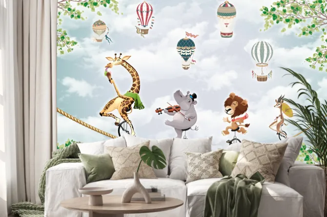 Zwierzęta z zoo na monocyklach jadące po linie.