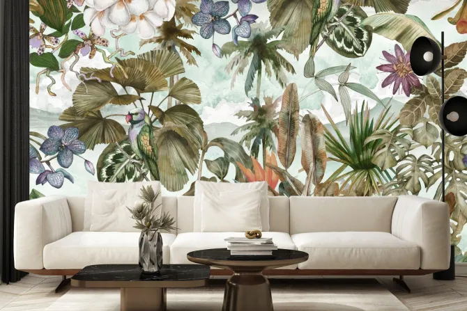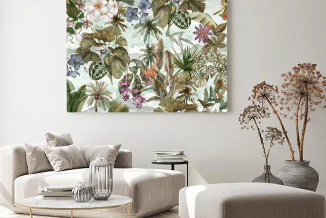 Obraz: Kolorowa papuga wśród liści i kwiatów