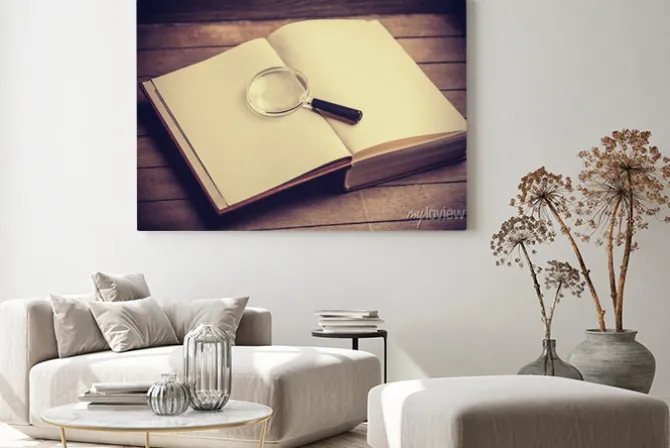 Obraz: Loupa i książka na drewnianym stole