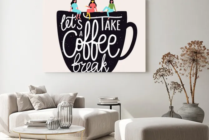 Vector flat style illustration with women talking to each other and cup. Let’s take a coffee break lettering quote. Colored typography poster with grunge dots.