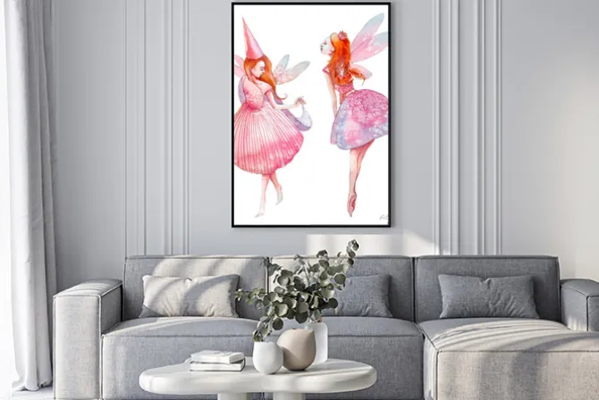 Plakat: Bajkowe wróżki na akwarelowym malunku
