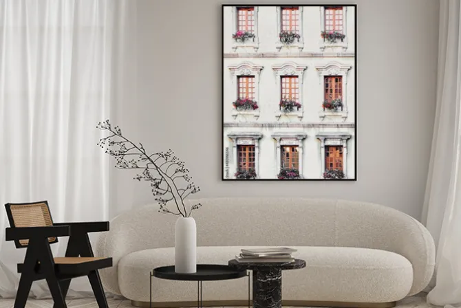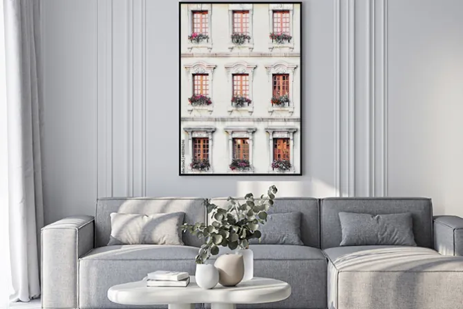 Plakat: Fasada budynku z kolorowymi kwiatami
