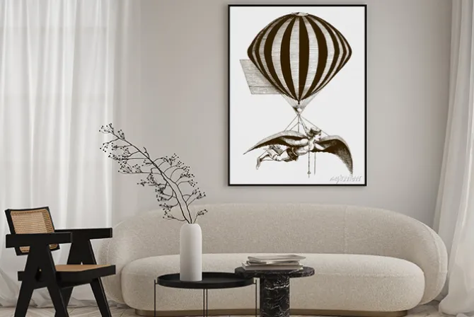 Plakat: Historic aerialist wearing wings while suspended from a balloon.