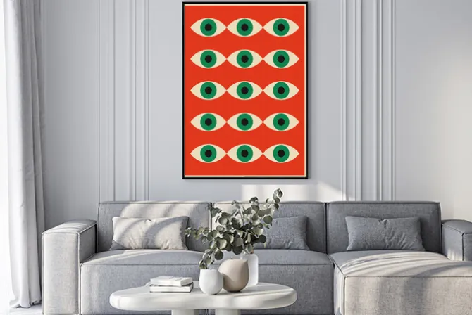 Plakat: Inspirowane bauhausem abstrakcja z zielonym okiem na czerwonym