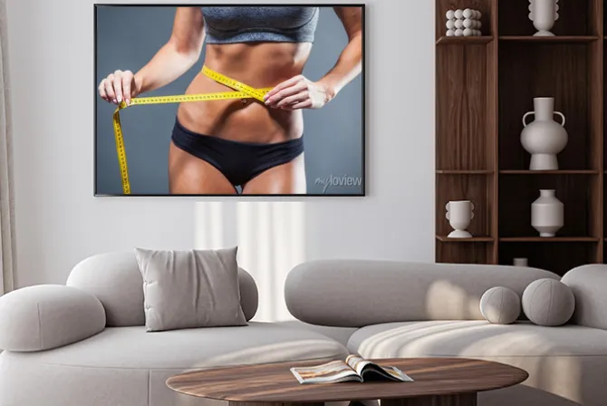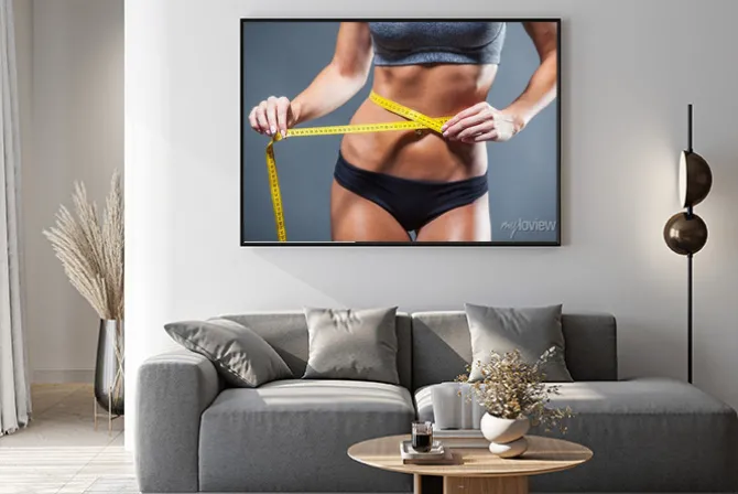 Plakat: Kobieta pomiaru jej talii z żółtą taśmą