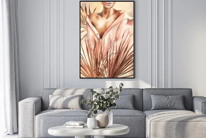 Plakat: Kobieta w koszuli wśród liści akwarela