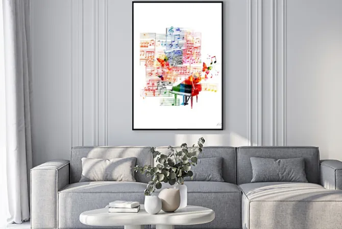 Plakat: Kolorowa ilustracja fortepianu z nutami