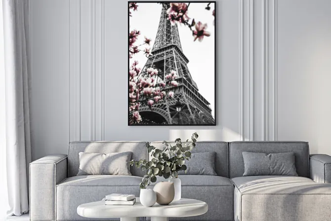Plakat: Kwitnące magnolie na tle wieży eiffla