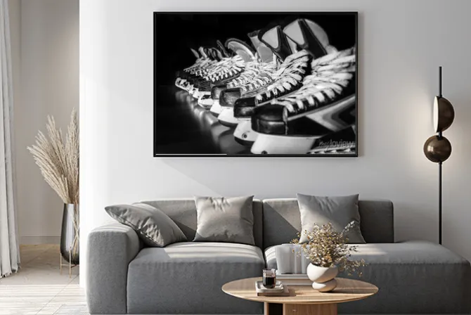 Plakat: Łyżwy hokejowe na czarno białym zdjęciu