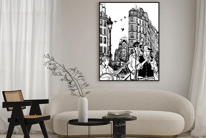 muzycy, jazz, muzyka, ulice, Paryż, szkic, instrumenty, mężczyzna, ludzie