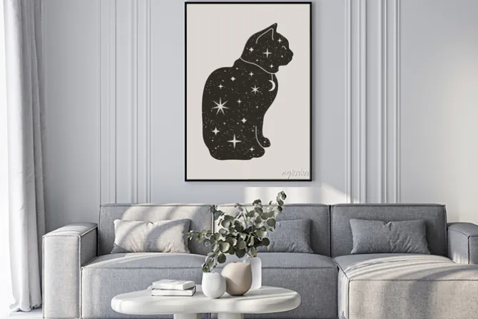 Plakat: Mystical black cat in trendy boho style. vector magic cat silhouette