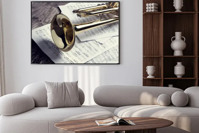Plakat: Nuty i trąbka na szarym drewnianym stole