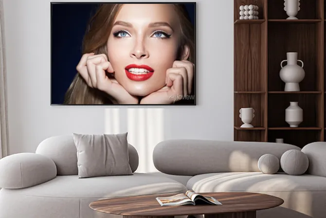 Plakat: Piękna dziewczyna z czerwonymi ustami z rękami w pobliżu twarzy