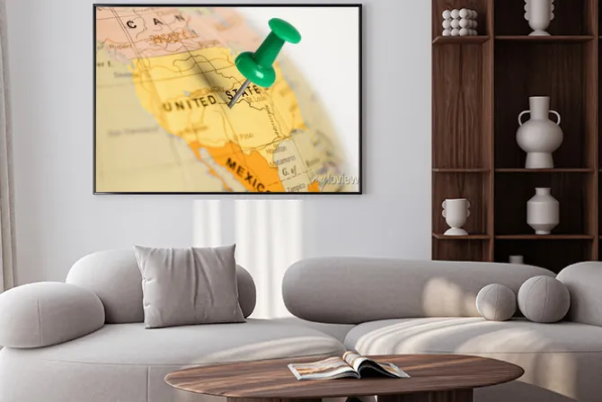 Plakat: Położenie stany zjednoczone. zielony pin na mapie.