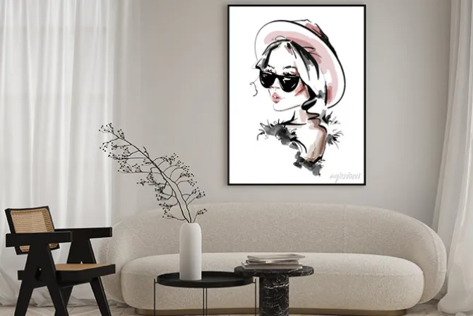 Plakat: Portret kobiety w kapeluszu i okularach w stylu rysunku