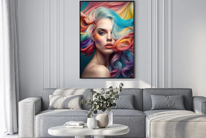 Plakat: Portret kobiety z kolorowymi włosami i makijażem
