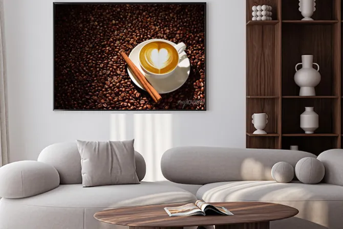 Plakat: Puchar latte sztuki, kawy i ziarna kawy