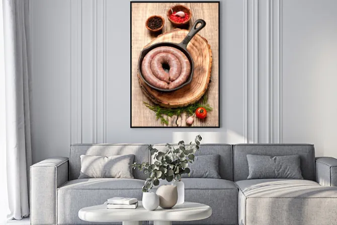 Plakat: Surowa kiełbasa na patelni
