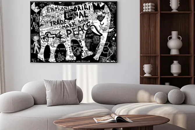 Plakat: Sylwetka słonia, który zawiera wiele symboli
