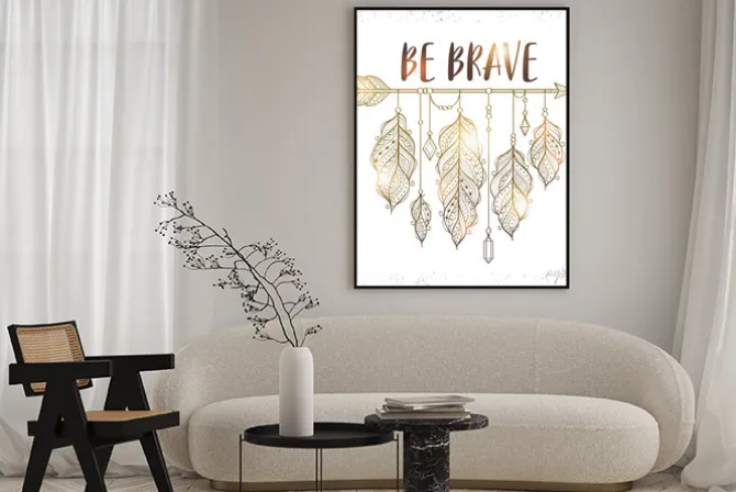Vector illustration with golden ethnic arrow and feathers in boho style. Motivational poster with „be brave” inscription.