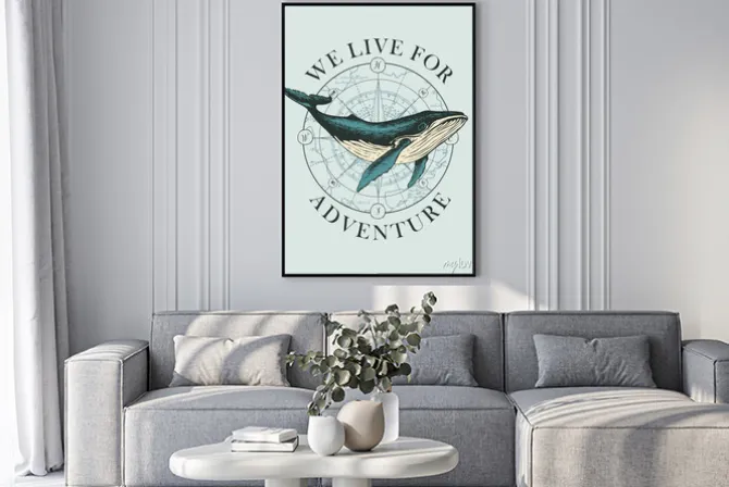 Plakat: Wieloryb z kompasem w tle i napisem we live for adventure