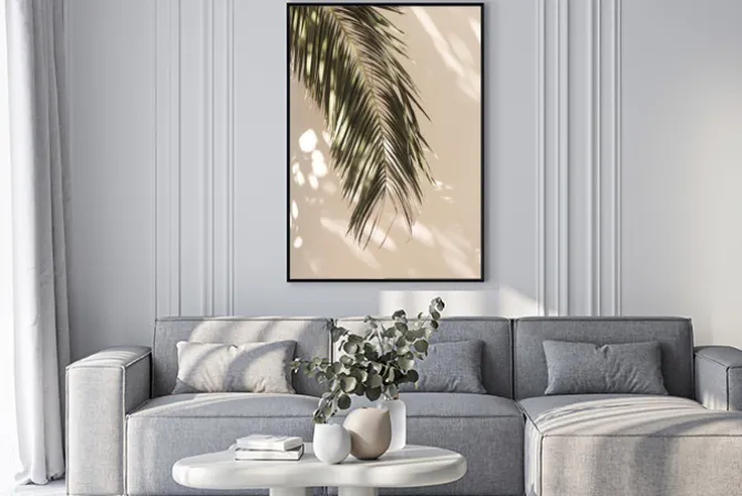 Zielony liść palmowy na beżowym tle w stylu boho.