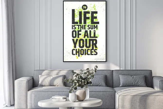 Plakat: Życie jest sumą wszystkich wyborów inspirujący cytat na kolorowym