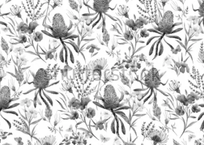 Akwarela tropikalny wzór, kwiaty, pomarańczowe bansias, oleander różowy, egzotyczne kwiaty Australii, czerwone kwiaty Eremophila dichroantha. monochromatyczny czarno-biały wzór.