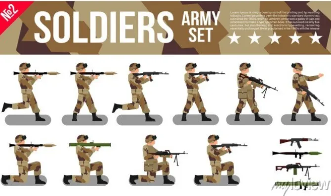 Armia Wojskowa Żołnierze Ustaw w Desert Digital Camouflage. Nowoczesne Wojskowe Kolekcja Wektorowe płaskie ilustracji.