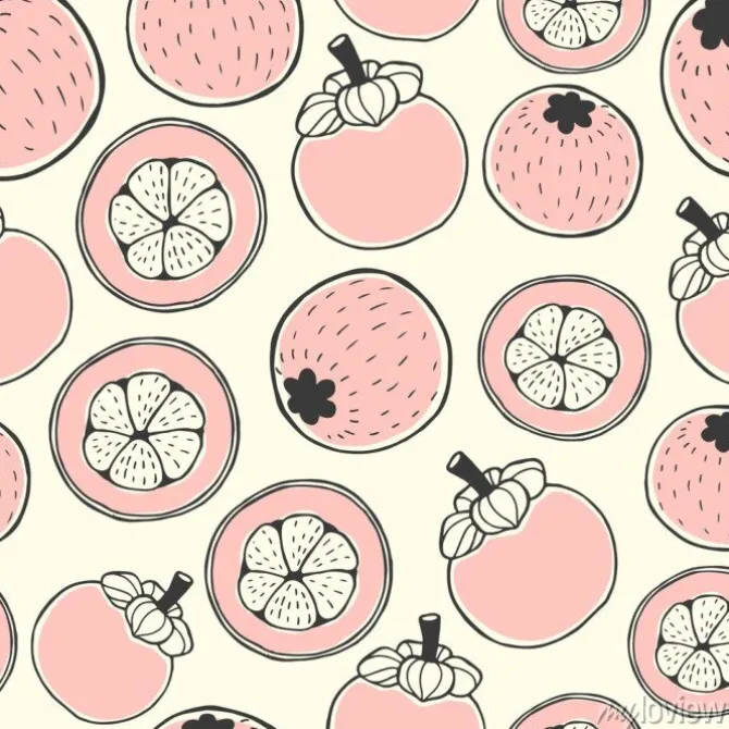 Bezszwowe wzór przyrody z szkicem jagód. Tło wektor różowy z mangostanem. Żywność tropikalna..