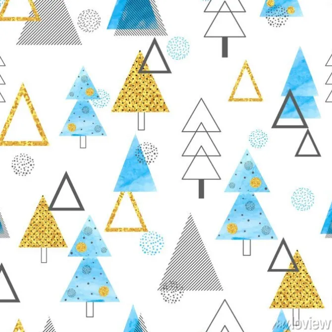 Bezszwowy choinka wzór w retro stylu. Tło wakacje wektor w kolorach złotym i niebieskim..