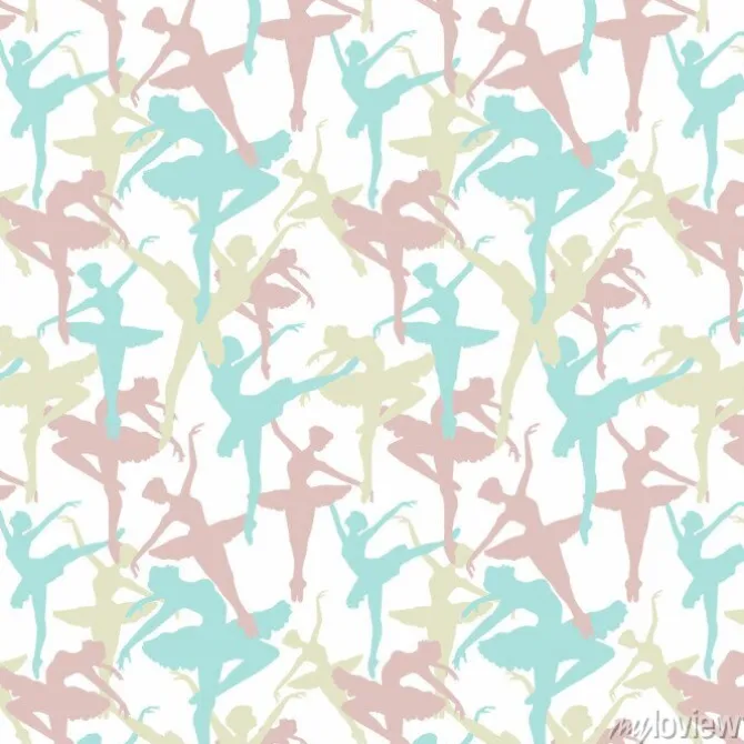 Jednolity wzór tańczących sylwetek baletnic w jasnoróżowych, niebieskich i żółtych kolorach.