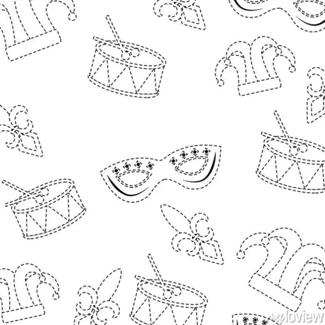 Maska bębna arlekin kapelusz fleur de lis karnawał akcesorium wzór obrazu wektorowe ilustracja projektowe czarnym linia przerywana.