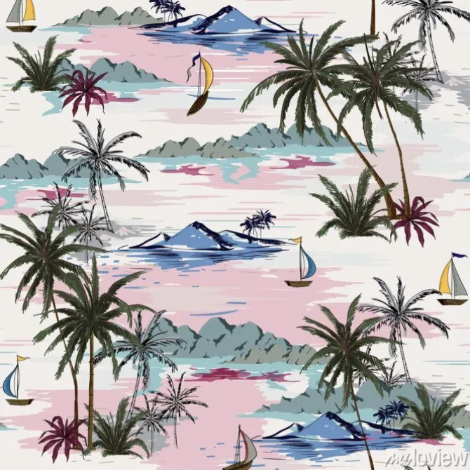 Tapeta: Piękny bezszwowy wyspa wzór na białym tle. krajobraz z palmami,