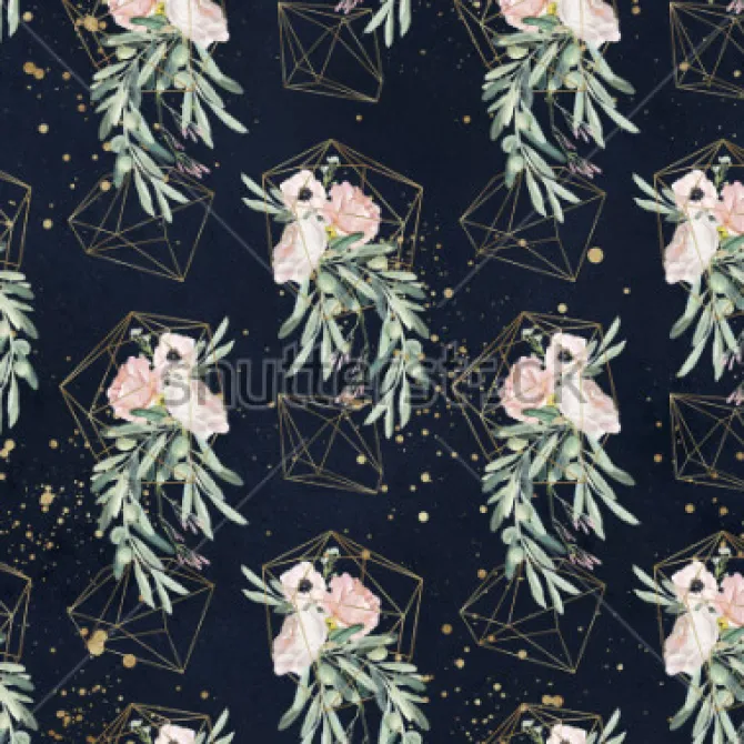 Połączone z kwiecistym wzorem kwiatowym z gałązkami oliwnymi, liśćmi, bukiety kwiatów rumieniec, plamy farb i złote kształty geometryczne na czarnym tle.