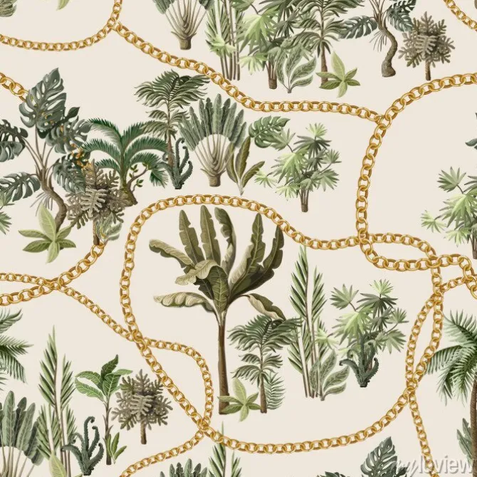 Seamless pattern with exotic trees such us palm, monstera and banana with chains..
