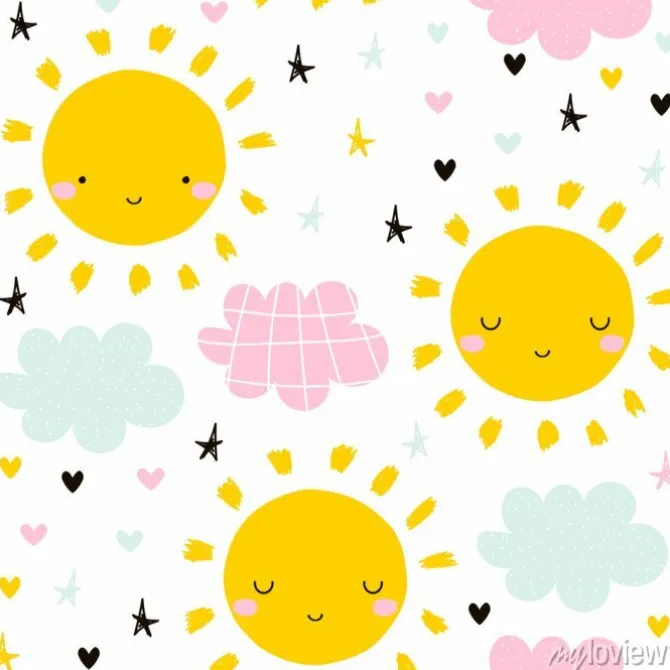 Tapeta: Śliczny bezszwowy wzór z słońcem i chmurami. grafika dla dzieci.