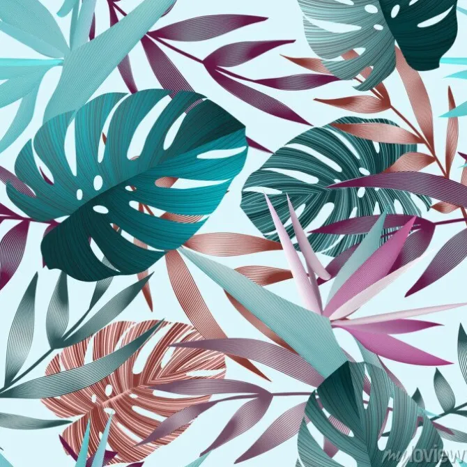 Tropikalne liście w odcieniach turkusu i fioletu.