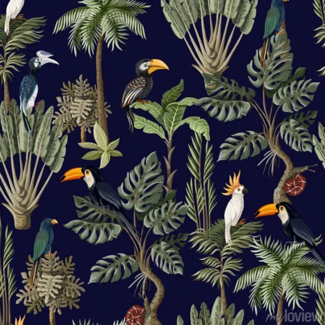 Wzór z egzotycznych drzew i ptaków.